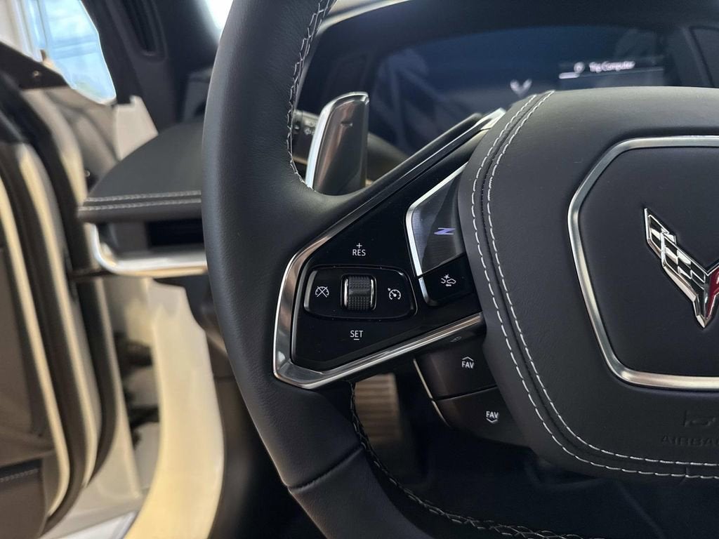Arctic White 2025 Chevrolet Corvette E-Ray 1LZ AWD 6.2L V8 8-Speed Dual Clutch Chrome Exterior Badge Package, Convertible Engine Appearance Package (Black LT2 Engine Cover and Engine Specification Plaque (LPO)), Preferred Equipment Group 1LZ, 10 Speakers, 4-Wheel Disc Brakes, 8-Way Power Driver Seat Adjuster, 8-Way Power Passenger Seat Adjuster, ABS brakes, Adaptive suspension, Air Conditioning, Alloy wheels, AM/FM radio: SiriusXM, Auto High-beam Headlights, Auto-dimming Rear-View mirror, Automatic temperature control, Brake assist, Bumpers: body-color, Ceramic disc brakes: front and rear, Chrome Lug Nuts (LPO), Chrome Wheel Locks (LPO), Compass, Convertible HardTop, Convertible roof lining, Delay-off headlights, Driver door bin, Driver vanity mirror, Dual front impact airbags, Dual front side impact airbags, Electronic Stability Control, Emergency communication system: OnStar and Chevrolet connected services capable, Four wheel independent suspension, Front anti-roll bar, Front Bucket Seats, Front Center Armrest, Front dual zone A/C, Front reading lights, Fully automatic headlights, Glass rear window, GT1 Bucket Seats, Heads-Up Display, Heated door mirrors, Illuminated entry, Integrated roll-over protection, Leather Shift Knob, Leather steering wheel, Low tire pressure warning, Mulan Lthr Seating Surfaces w/Perforated Inserts, Navigation System, Occupant sensing airbag, Outside temperature display, Overhead console, Panic alarm, Passenger door bin, Passenger vanity mirror, Power convertible roof, Power door mirrors, Power driver seat, Power passenger seat, Power steering, Power windows, Premium audio system: Chevrolet Infotainment 3 Plus, Radio data system, Radio: Chevrolet Infotainment 3 Premium System, Rapid Blue & Carbon Flash E-Ray Badges (LPO), Rear anti-roll bar, Rear window defroster, Remote keyless entry, Speed control, Speed-sensing steering, Spoiler, Sport steering wheel, Steering wheel mounted audio controls, Sterling Silver-Painted LT2 Engine Cover, Tachometer, Telescoping steering wheel, Tilt steering wheel, Traction control, Trip computer, Turn signal indicator mirrors, Variably intermittent wipers, Voltmeter, Wheels: 20 x 10 Fr/21 x 13 Rr Bright Polished, and Wheels: 20 x 10 Fr/21 x 13 Rr Pearl Nickel.