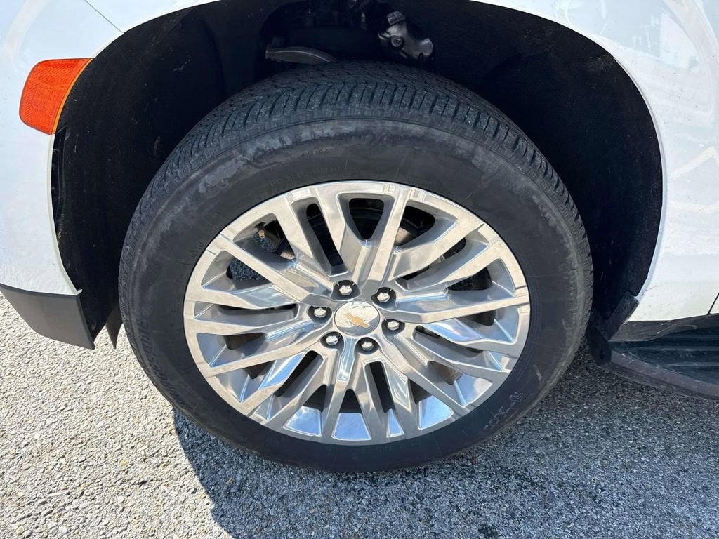 Driver Alert Package (Lane Change Alert w/Side Blind Zone Alert and Rear Cross Traffic Alert), Preferred Equipment Group 1LS (1st & 2nd Row Color-Keyed Carpeted Floor Mats, Color-Keyed Carpeting Floor Covering, Driver & Front Outboard Passenger Airbags, Floor Console w/Storage Area, LED Daytime Running Lamps, Remote Start, SiriusXM w/360L, and Wrapped Steering Wheel), 1st & 2nd Rows All-Weather Floor Liners (LPO), 3.23 Rear Axle Ratio, 3rd row seats: split-bench, 4-Wheel Disc Brakes, 6 Speakers, 6-Speaker Audio System Feature, ABS brakes, Air Conditioning, All-Weather Cargo Mat (LPO), Alloy wheels, AM/FM radio: SiriusXM with 360L, Apple CarPlay/Android Auto, Auto High-beam Headlights, Automatic temperature control, Brake assist, Bumpers: body-color, Compass, Delay-off headlights, Driver door bin, Driver vanity mirror, Dual front impact airbags, Dual front side impact airbags, Electronic Stability Control, Emergency communication system: OnStar and Chevrolet connected services capable, Four wheel independent suspension, Front anti-roll bar, Front Bucket Seats, Front Center Armrest, Front dual zone A/C, Front High-Back Reclining Bucket Seats, Front reading lights, Fully automatic headlights, Heated door mirrors, Illuminated entry, Infotainment Display, Low tire pressure warning, Occupant sensing airbag, Outside temperature display, Overhead airbag, Overhead console, Panic alarm, Passenger door bin, Passenger vanity mirror, Power door mirrors, Power driver seat, Power passenger seat, Power steering, Power windows, Premium audio system: Chevrolet Infotainment 3, Premium Cloth Seat Trim, Premium Smooth Ride Suspension, Radio: Chevrolet Infotainment 3 System, Rain sensing wipers, Rear air conditioning, Rear anti-roll bar, Rear reading lights, Rear seat center armrest, Rear window defroster, Rear window wiper, Remote keyless entry, Roof rack: xxxxxx, Security system, Set of 4 Wheel Locks (LPO), Speed control, Speed-sensing steering, Split folding rear seat, Spoiler, Steering wheel mounted audio controls, Tachometer, Telescoping steering wheel, Tilt steering wheel, Traction control, Trip computer, Variably intermittent wipers, Vertical Cargo Net (LPO), Voltmeter, Wheels: 18 x 8.5 Bright Silver Painted Aluminum, and Wheels: 22 x 9 Polished Aluminum.